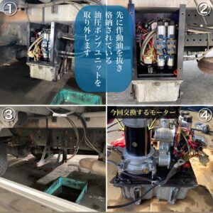 ウィングの開閉は作動油タンクから吸い込まれた作動油が圧油となりシリンダの動きによって開閉されているのですが、吸い込むためのポンプを動かすモーターの内部にあるブラシが削れ上手く稼働しなくなってしまったのが原因でした。